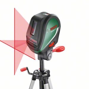 Cross Line Laser UniversalLevel 2 – Set, Projects your ideas precisely on the wall, Accurate projection of a laser cross with additional top and bottom plumb points, Laser points and lines automatically align and are straight due to self-levelling function, Incline function for working outside of self-levelling range with diagonal laser lines, High-quality, bright laser diodes with accuracy of +/- 0.5 mm/m for precise working results, Opening angle of 120° for long laser lines even at short working distances, Batteries, 1.1 m aluminium tripod, Bag