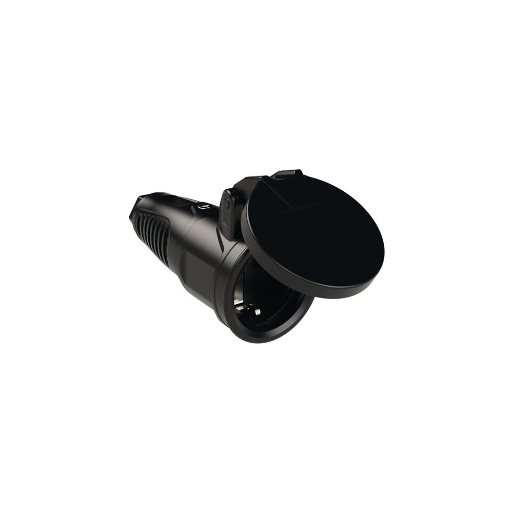 1,00 ST Coupling with earthing contact 10-/16 approx. A 250 V black IP44 solid rubber, w. spring-loaded drop lid