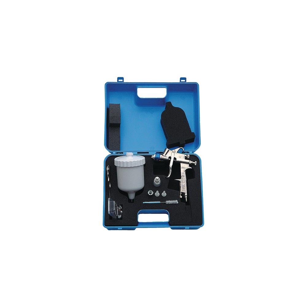 – Thanks to the standard stainless steel components, can also be used to apply varnishes, fillers and water-based primers Contents: Painting gun, flow cup (plastic spare parts kit, key, cleaning set, steel coupling nipple, care oil, with 1.3 mm Ø nozzle