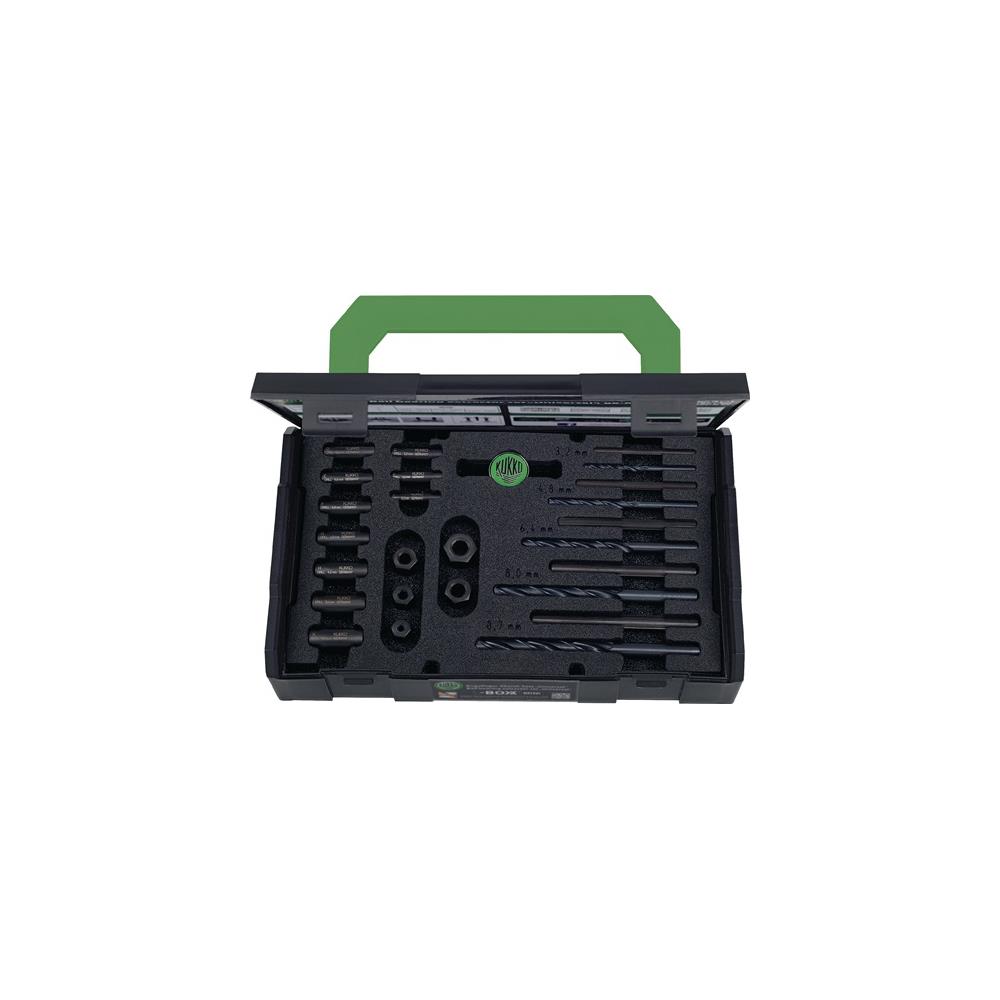 – Complete with screw extractors, HSS twist drills and drill/guide bushing for problem-free boring, even for broken parts deep in threaded holes