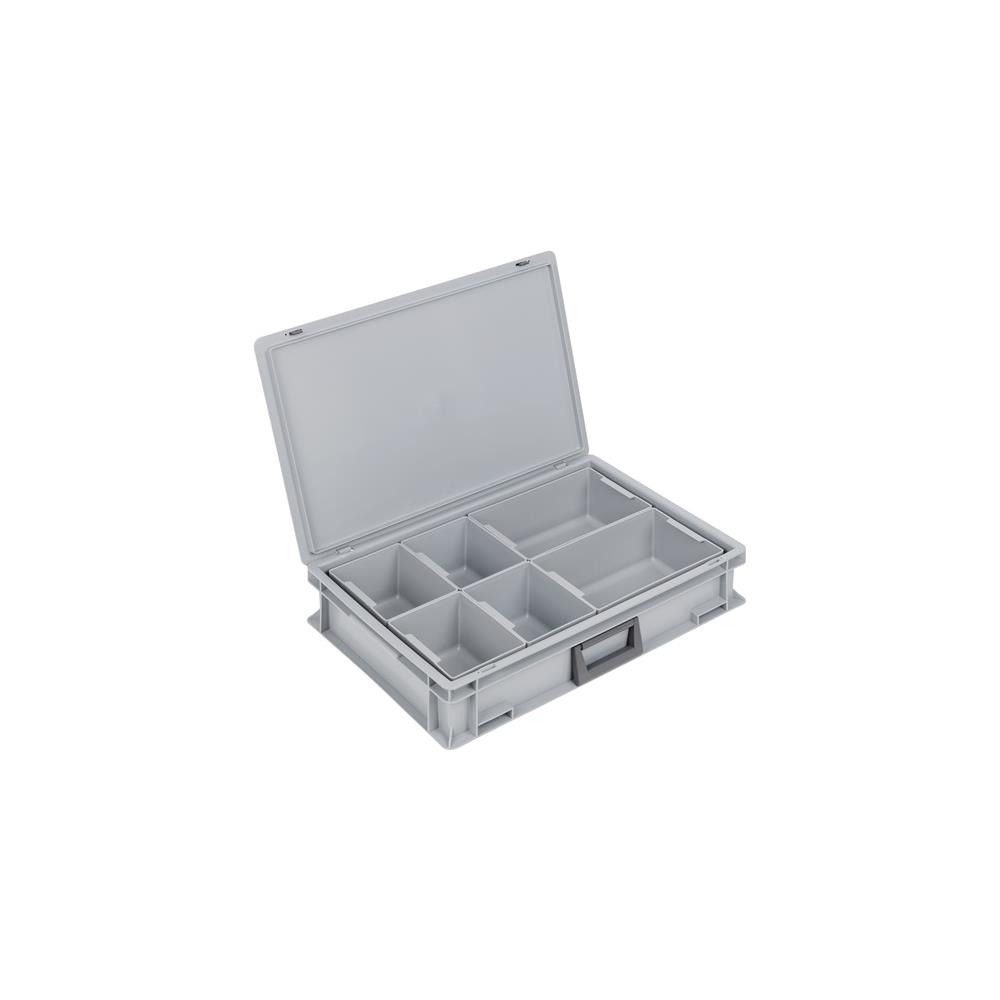 LOCKWEILER Plastic case L 600 x W 400 x H 133 mm PP 1 handle 6 Insert boxes + slide fastener grey 24 l
