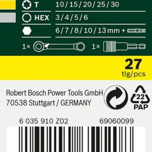 – For use with hand and power tools (conventional cordless screwdriver) Contents: 1 bit holder (65 mm) 1 bit ea. for slotted head screws (green) in 3, 4, 5, 6 mm 1 bit ea. for Phillips (PH) screws (red) in sizes 1, 3 2 bits for Phillips (PH) screws (red) in size 2 1 bit ea. for pozidriv (PZ) screws (blue) in sizes 1, 3 2 bits for pozidriv (PZ) screws (blue) in size 2 1 bit ea. for screws with internal TORX® profile (orange) in T 10, T 15, T 20, T 25, T 27, T 30, T 40 1 bit with bore ea. for screws with internal TORX® profile (incl. locking pin) (dark pink) in T 10, T 15, T 20, T 25, T 27, T 30, T 40 1 bit ea. for screws with hexagon socket profile (yellow) in 3, 4, 5, 6 mm 1 adapter, 6.3 mm (1/4) external square to 6.3 mm (1/4) hexagon head for driving socket bits with power tools (conventional cordless screwdriver) Further technical information: