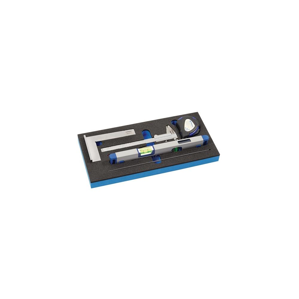 – Height: 30mm Contents: 1 pocket calliper gauge with setscrew, measuring range 150 mm, readout mm/inch – 0.05 / 1/128 1 try square 150 x 100 mm 1 steel rule 300 mm 1 scriber 150 mm 1 spirit level 30 cm 1 pocket retracting tape measure 5 m