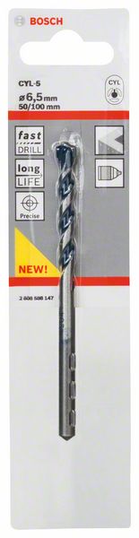 The CYL-5 Drill Bit guarantees extra-long durability when drilling concrete and stone. The combination of a carbide blend developed in-house by Bosch and diamond-ground cutting edges makes the bit extremely wear-resistant. Friction on the flute from drilled material is notably reduced thanks to a 2-flute vario design with a short, variable incline providing good dust removal and wear reduction. The Bosch Power Grip Shank System enables 100% power transfer from machine to drill bit. This allows a direct use of power for drilling with no power loss and thus less wear. For use when drilling holes for fixings in concrete, natural and artificial stone. As proof of quality, the drill bit bears the quality test mark of the PGM Masonry Drill Bit Association Board guaranteeing compliance with tight tolerances, exactly drilled holes and a firm hold on fixings.