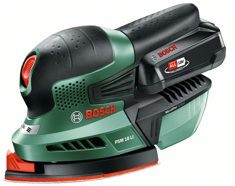 Cordless Multi-Sander PSM 18 LI, Powerful, compact, multi-talented sander with cordless freedom, Powerful all-rounder for corners, edges, and medium-sized flat surfaces, Change the sanding attachments quickly and easily via the SDS system, Microfilter dust box reduces dust for a cleaner working area, Compatible with Bosch 18V POWER FOR ALL battery, Use on hardwood, softwood, varnished and painted surfaces, POWER FOR ALL: One battery and charger for an entire Home & Garden tools system, Syneon Technology regulates energy use for optimal efficiency and longer runtime, 1 x battery PBA 18V 2.5Ah, 3 sanding sheets K 80, K 120, K 160 (2 609 000 178), Charger AL 1830 CV, Carton