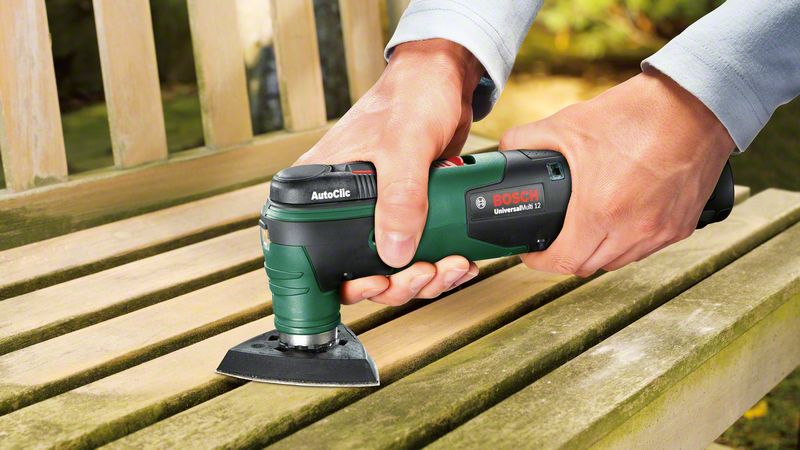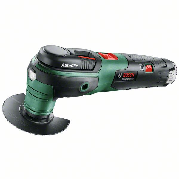 Cordless Multifunction Tool UniversalMulti 12, Versatile, cordless solution for a wide range of DIY jobs, Powerful motor with electronic speed preselection, Bosch AutoClic system enables 3-second, keyless accessory changes, Wide range of Starlock accessories available for multiple applications, Integrated LED for lighting the working area, Cut, saw, sand, scrape, route, rasp, and polish a wide range of materials, POWER FOR ALL: One battery and charger for an entire Home & Garden tools system, Syneon Technology regulates energy use for optimal efficiency and longer runtime, ACZ 85 EB (2 609 256 943), AIZ 32 EPC (2 609 256 947), Delta sanding plate 93 mm, AVZ 93 G (2 609 256 956), Delta sanding sheet set (2 609 256 A54), 4-stage depth stop for segment saw blades (2 609 256 C61), Carrying case