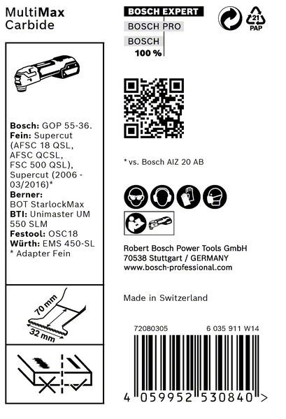 Long Life Cutting Sheet Metal and Abrasive Materials! Extra coating makes carbide tougher! Whether you work on buildings or vehicles, a multitool blade that makes a great cut in any material can make working life a lot easier. Integrating all of Boschs most advanced manufacturing techniques, the EXPERT MultiMax brings unrivalled versatility to your multitool. Bosch Curved-Tec blades became a firm favourite thanks to their ability to plunge neatly into materials and deliver difficult cuts to a high standard. With the Bosch EXPERT MultiMax Blade for Multitool you can bring this plunge cutting ability to the toughest materials, such as sheet metals, carbon fibre and red brick. Exceptional durability is built in with Bosch Carbide Technology.