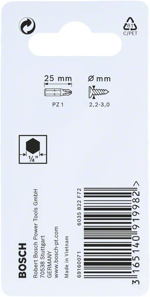 Robert Bosch Power Tools GmbH Impact Control Insert Bit 25 mm, 2xPZ1. For screwdrivers