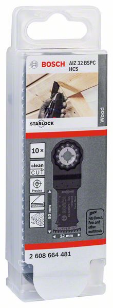 The Starlock AIZ 32 BSPC blade delivers clean cuts in hardwood. Its 3-dimensional Japanese tooth configuration consists of sharp ground teeth ideal for tear-free cutting. This tooth arrangement minimises heat development, for making very clean cuts with no ripping or burning. It offers a sturdy mounting system that reduces wobbling and enables precision due to direct power transmission. This product is intended for plunge cutting in hardwood, for cutting recesses in furniture components and for sawing wood panels. The blades rounded cutting edge (Curved-Tec) makes precise and smooth plunge cuts. The Starlock Snap-In mounting system allows fast blade removal and exchange within 3 seconds without having to touch the blade. The mounting system produces the highest power transfer thanks to a 3-dimensional tight-fitting connection between machine and accessory.