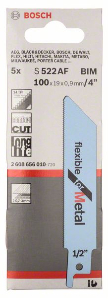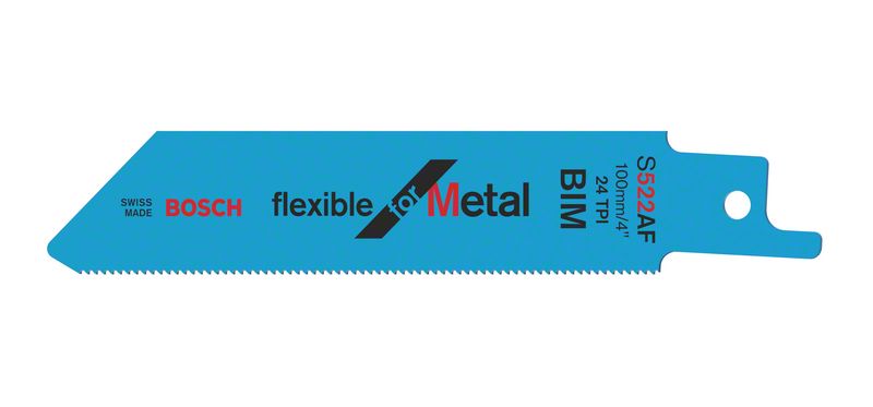 The S 522 AF Flexible for Metal Reciprocating Saw Blade is designed for use with compact saws. Its very fine tooth pitch and wavy-set teeth enable effortless smooth cuts in thin material. Moreover, the BIM (bi-metal) blade is engineered for a long lifetime when cutting regular-strength sheet steel. Equipped with a very fine tooth pitch (1 mm), the reciprocating saw blade cuts sheet metal with a thickness of 0.7 mm to 3 mm. Its short length (100 mm) enables a cutting capacity up to 50 mm and it is ideal for use with cordless compact saws.