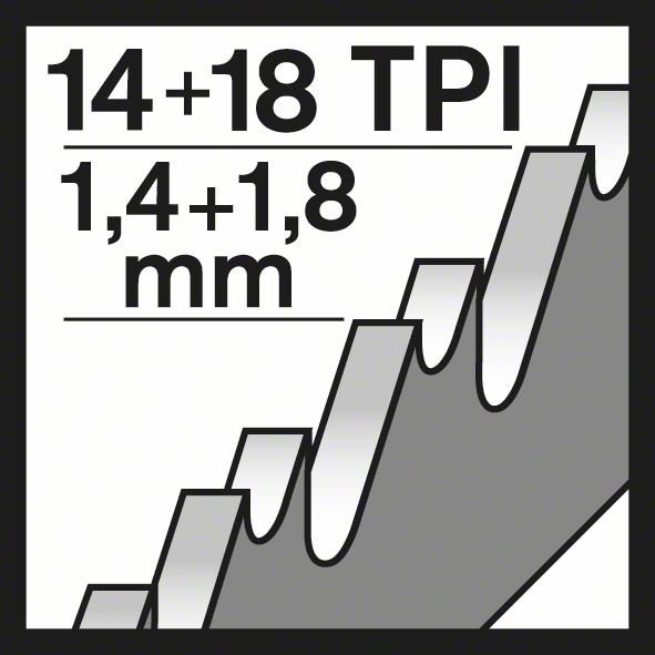 Specific RTB3: Tooth pitch (1.4+1.8 mm) for cutting thin-wall steel pipes and profiles. Standard length for a 100 mm cutting capacity