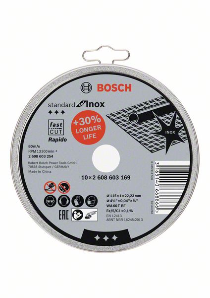 The Standard for Inox Rapido Cutting Disc enables reliable performance in Inox. Its thin disc edge supports smooth and easy cutting. In addition, the disc is free from ferrous, sulphurous and chlorinated fillers. Use this disc for cutting Inox. Bosch cutting discs comply with the maximum safety requirements, such as EN 12413.