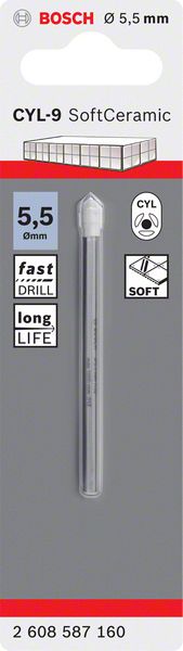 The CYL-9 SoftCeramic Tile Drill Bit is the standard choice when drilling in tiles. Dry drilling without lubrication is possible, which makes working with this bit effortless and convenient. Additionally, it has a simple flute-less design, which is especially suitable for drilling through soft-to-medium hard tiles. Drill without impact at low speeds.