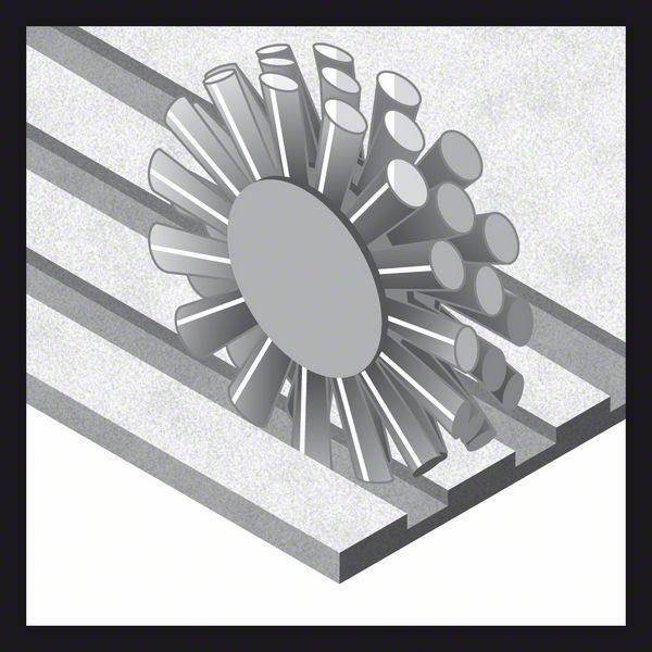 The Wire Wheel provides a good fine surface finish. Fitted with crimped wire for light- to medium-duty cleaning applications on small surfaces, it is ideal for removing annealing colour on welded seams. The wire wheel is suitable for cleaning work at high circumferential speeds on smaller steel surfaces, edges or in grooves. Moreover, it is suitable for removing rust, roughing, mat sanding and paint stripping. Brush wires are available in different thicknesses for variable levels of abrasive needs. Thicker wires are more aggressive, producing a coarser yet faster surface finish, while thinner wires deliver finer, smoother surface results.