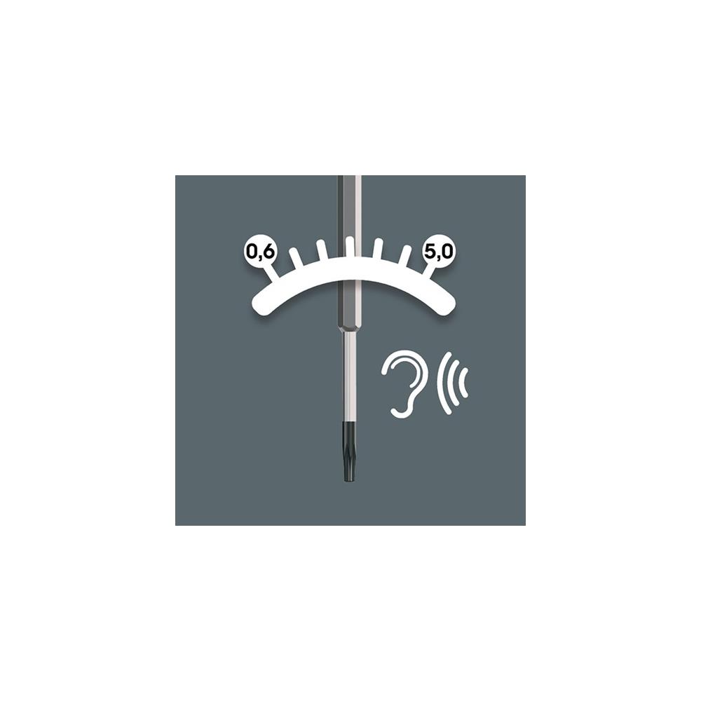 – Accuracy +/- 10 % – Pre-set, tamper-proof torque – Long, slim blade with just 4 mm hexagon – Pre-set torque protected from tampering by sealing ring – Unlike tightening torque, loosening torque not limited – Handle marked with drive symbol, size and pre-set torque Further technical information: